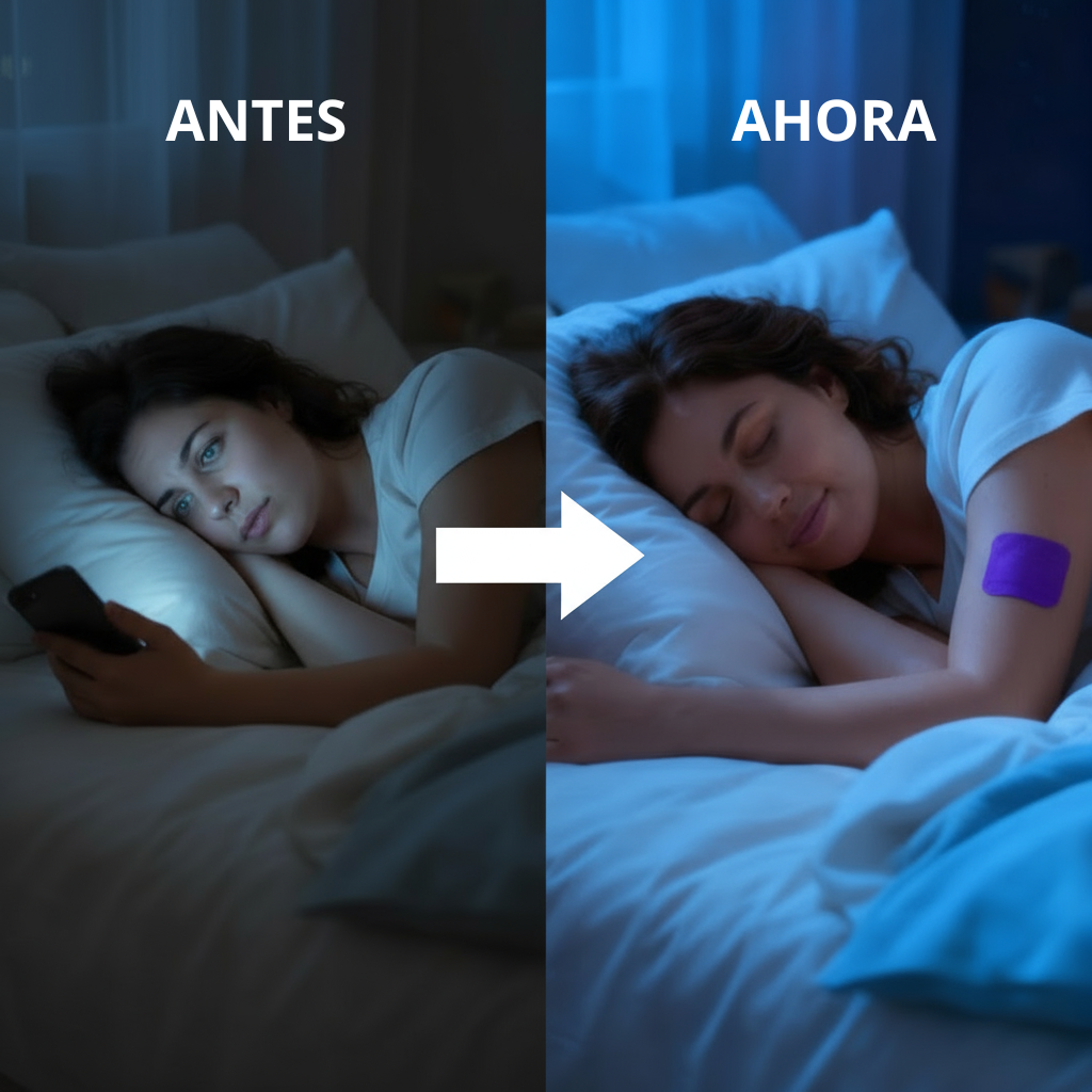 Te acuestas, te colocas SleepPatch™ y sientes cómo tu cuerpo se relaja. Tu mente se apaga poco a poco y el sueño llega de manera natural. Duermes profundo, sin interrupciones, y despiertas con energía.